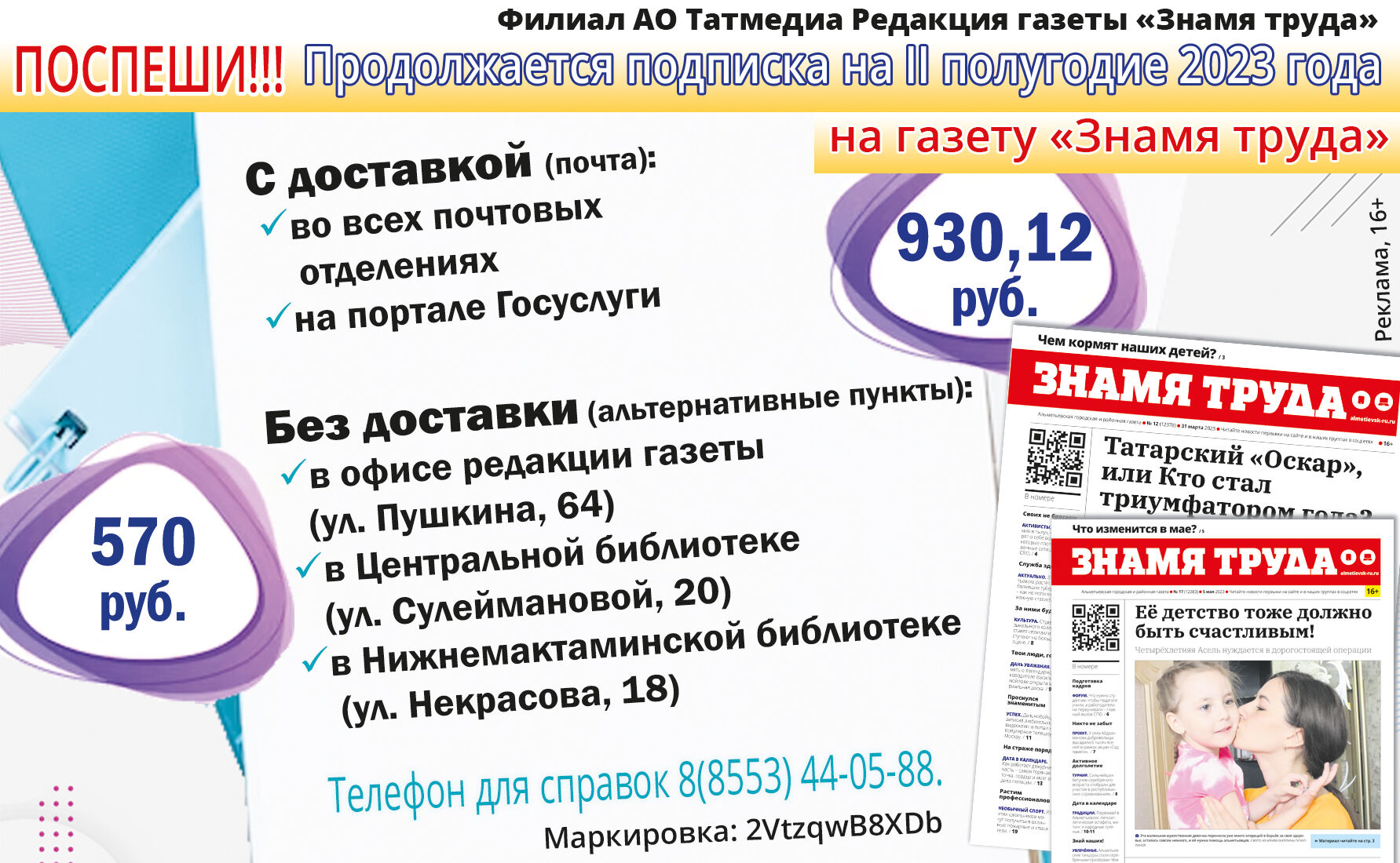 ПРАЙС-ЛИСТ на публикацию и изготовление рекламных и информационных материалов в газетах «Знамя труда» и «Элмэт таннары» с 01.10.2025