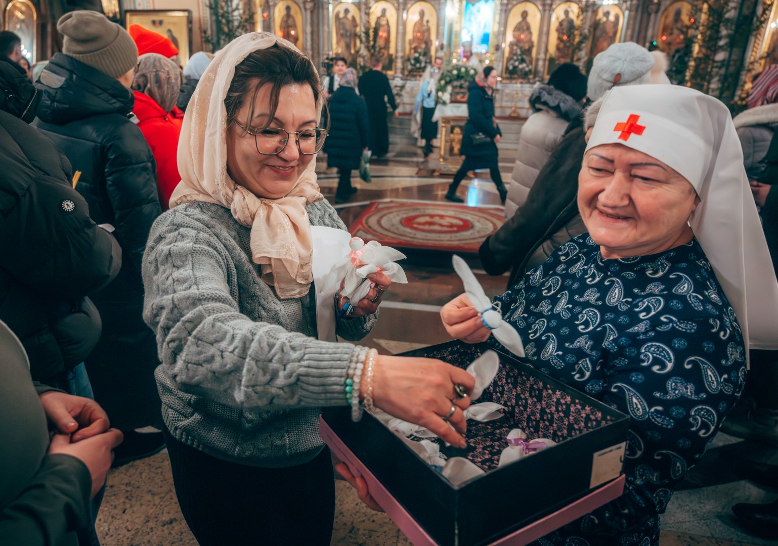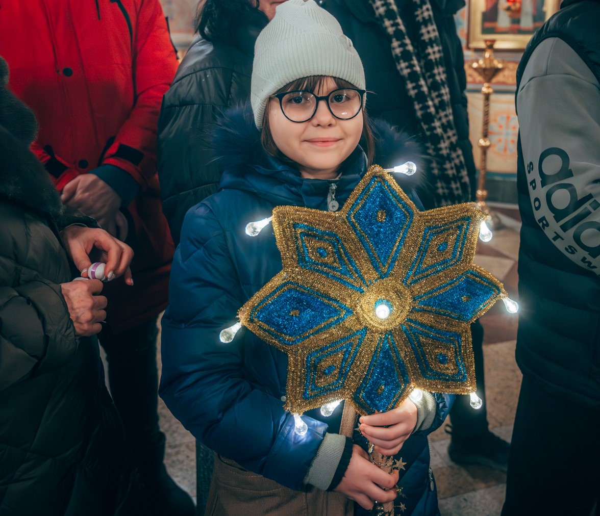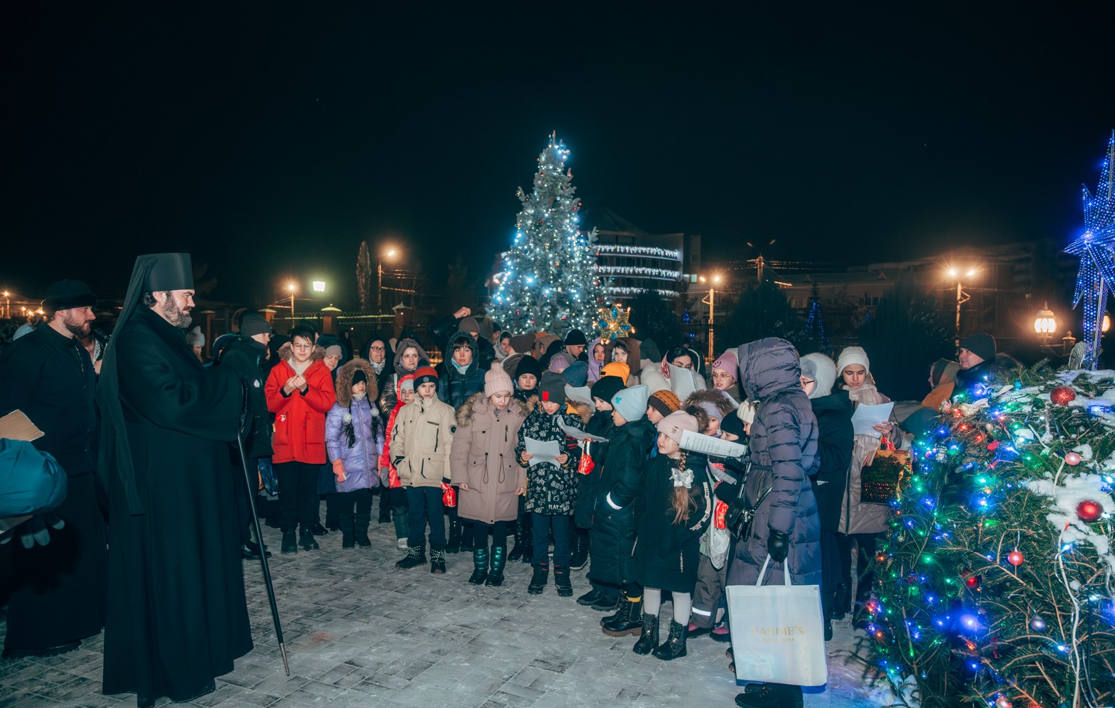Самым маленьким прихожанам, молившимся до конца праздничной службы, вручили сладкие подарки. По окончании торжественного богослужения, верующих ждал сюрприз – праздничный салют и традиционное пение колядок возле Рождественского вертепа на площади Кафедрального Собора. В завершении пения колядок всем участникам раздали праздничные рождественские шоколадки.