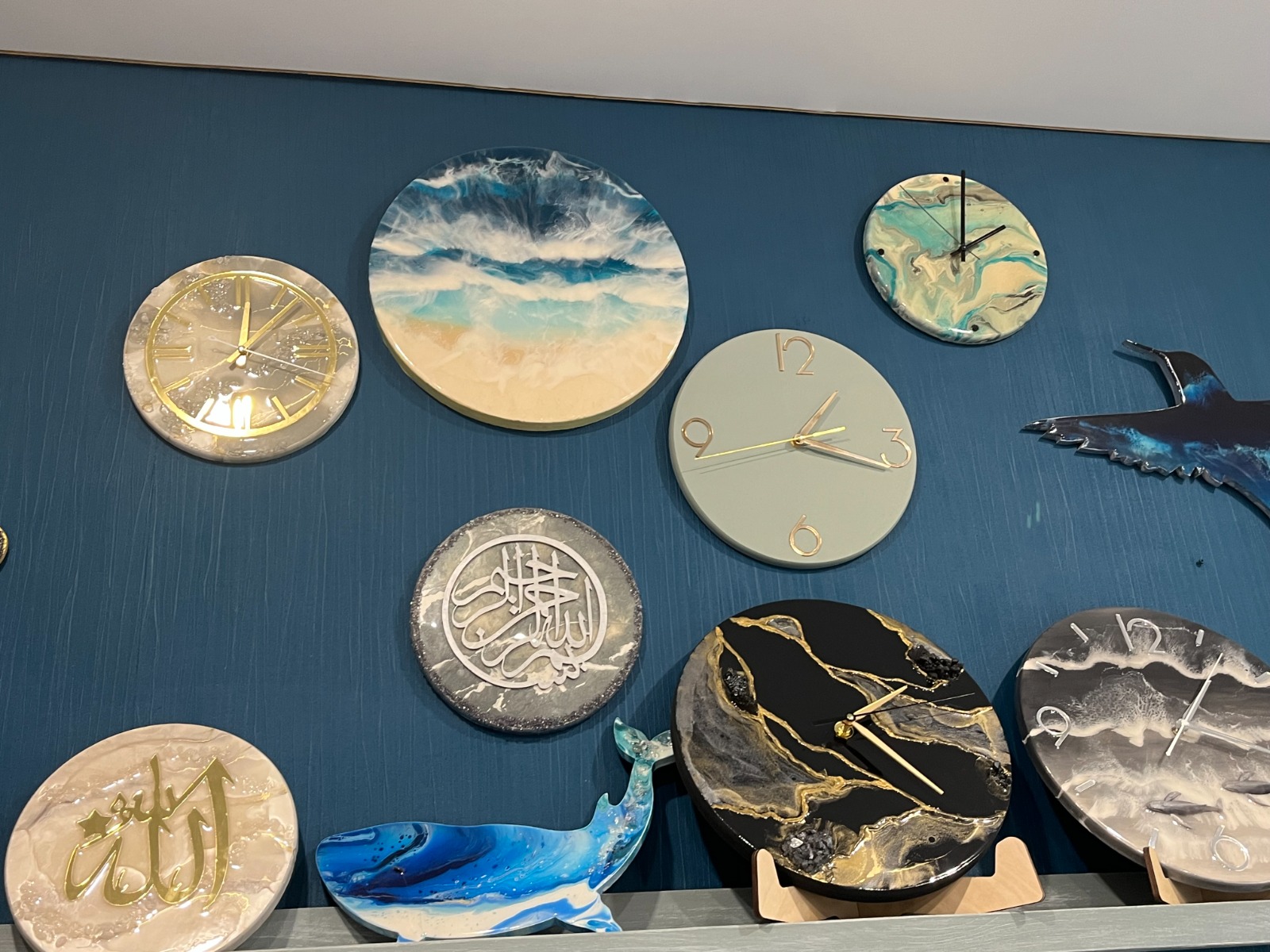Занятие проходит в небольших группах по 4-5 человек и начинается с подробного объяснения процесса работы и техники безопасности. Затем каждый выбирает, что хочет создать. Это могут быть часы в морском стиле с россыпью ракушек, шамаиль, декоративные тарелочки, подносы, столики, панно, картина, да все, что угодно. Еще нужно продумать цветовую гамму своего творения, выбрать необходимые аксессуары: стрелки, цифры, текст молитвы, декоративные камешки; затонировать основу будущей поделки и прорисовать линии, по которым будет ложиться смола.