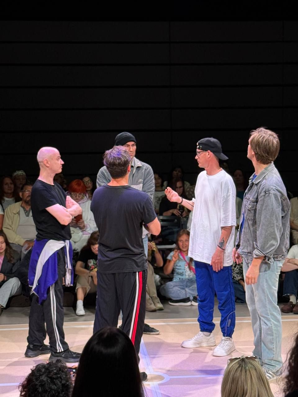 — В основе постановки лежат реальные воспоминания пятерых одноклассников из провинциального города, собранные в документальный текст. Эти пятеро парней – я и мои друзья детства. Я опросил их о самых ярких событиях нашего взросления и на этой основе поставил спектакль, в котором сам тоже участвую в качестве актёра, — поделился Дмитрий Крестьянкин.